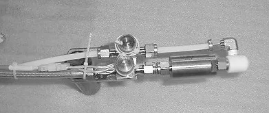 左边的照片显示了 A 型喷嘴区域的特写 - 有两个电磁阀,一个用于 CO 2 ,另一个用于干燥气体。CO 2流上显示有过滤器。白色聚合物喷嘴是压缩气体围绕二氧化碳流进入和退出的地方。右图中显示了型号 K6-10DG-B 的俯视图。手动阀控制干燥压缩空气或氮气流量。两个流上都有可选过滤器。任一单元都可以使用加热的第二气流来帮助减少水分。