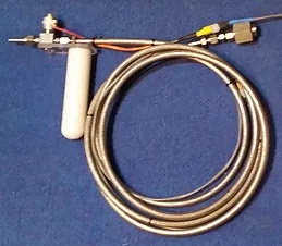 对于半自动操作,可以选择 24VDC 或电磁阀(下面带有压缩配件的阀门特写)来代替 90 度。开/关阀如上所示。该装置称为 K4-10S,电磁阀和喷嘴的特写如下左图所示。K4-10S 装置上配有文丘里喷嘴、24 V 直流常闭电磁阀、10 英尺 PTFE 内衬柔性不锈钢编织软管、CO2 气瓶配件、24 VDC 电源(CE 认证,120 至 250 VAC 输入),以及用于手动控制的脚踏开关。选项包括在线过滤器和压力表。右图显示了第一款完全便携式 CO2 Smow Jet K4-10S-Port。它可以配备锂离子电池或普通的脚踏开关。