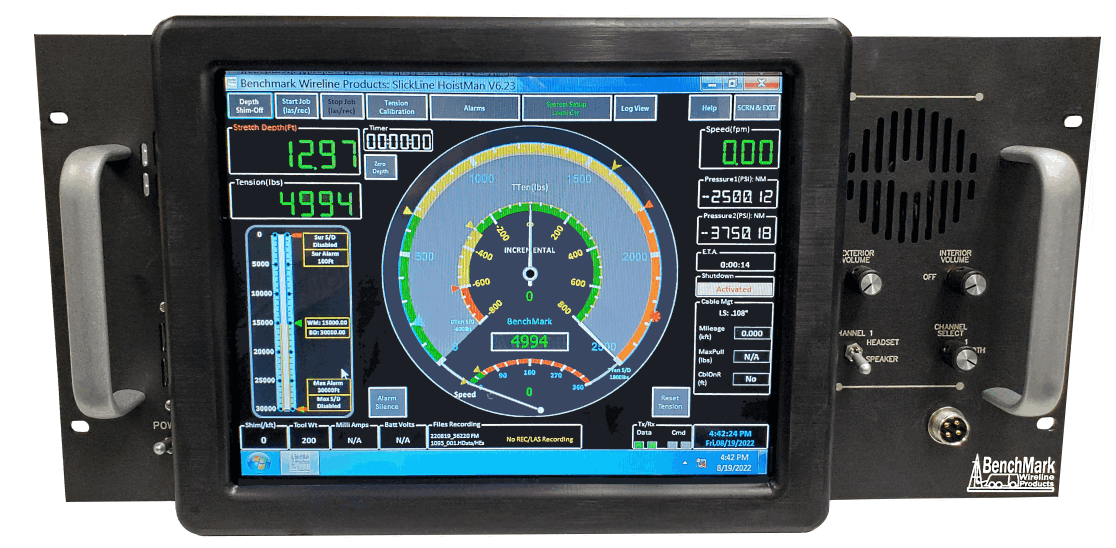 BenchMark Wireline 的Hoistman触摸屏面板用于采集和显示来自钢丝测井绞盘装置的深度和张力数据。该面板为操作员提供了一种根据需要设置和调整数据的方法。深度是根据安装在测量设备上的编码器提供的数据显示的。